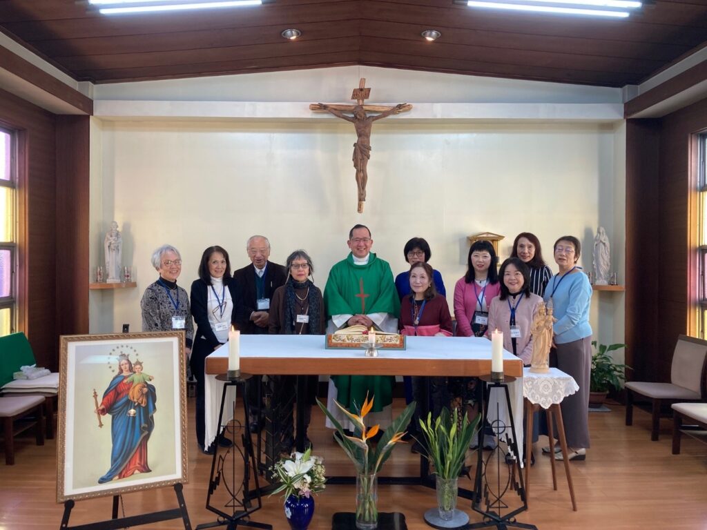 指導司祭は岡本神父様。ミサ後、岡本神父様のお説教や身近なこと等から、マリア様への思いなどをそれぞれが話し、分かち合った。その後、岡本神父様を囲んでのささやかな懇親会を行った。