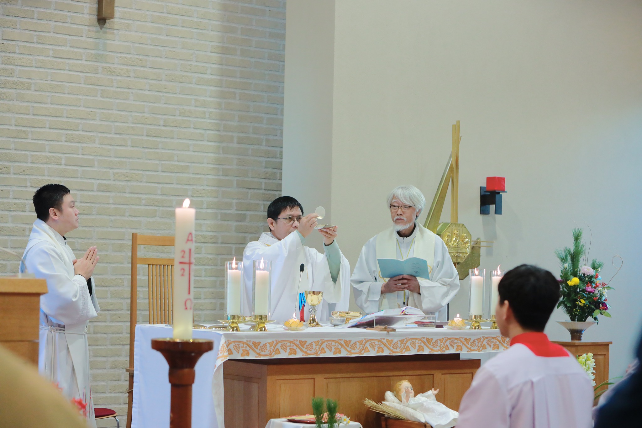 ミサはラップ神父の司式で、共同司式者として濱口管区長、ヒエン神父(目黒教会)、フー神父(町田支部)が参加した。ミサの終わりには濱口管区長の挨拶があり、「ここは皆さんの家です。どうぞ思いきり楽しんでください。」という歓迎の言葉が述べられた。その後、ラップ神父が、須藤修道士やフクハイ修道士、田村神父を紹介した。